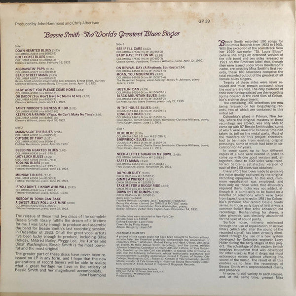 This is an auto-coupled release; Record 1 comprises sides A and D; Record 2 comprises sides B and C. In addition to the master catalog number, each disc has its own unique catalog number printed below the master number on the label. This is the first of five two-record sets. This contains the first 16 and last 16 of her recordings. Issued in gatefold sleeve with booklet. Santa Maria pressing, indicated by S scratched into the runout groove All selections were recorded in New York City.