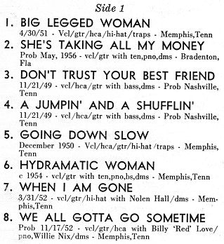Recorded in Memphis, Tenn., prob. July 27, 1950 (B2), November 27, 1950 (B5), December 1950 (A5), c. 1951 (B7), April 30, 1951 (A1), prob. April 30, 1951 (B1), March 31, 1952 (A7), July 18, 1952 (B8), November 17, 1952 (B4), prob. November 17, 1952 (A8), c. 1954 (A6), c. 1956 (B6)