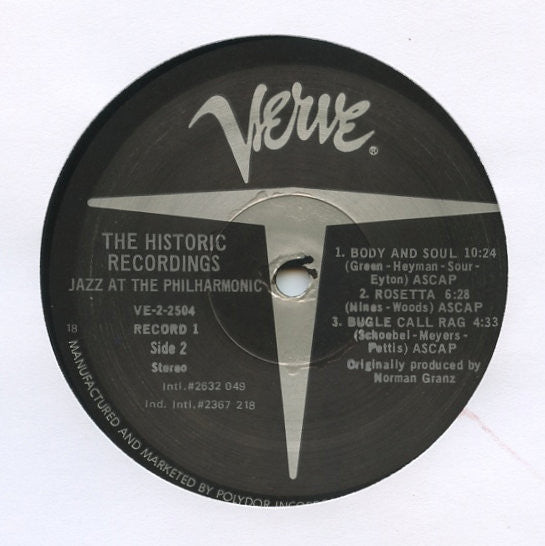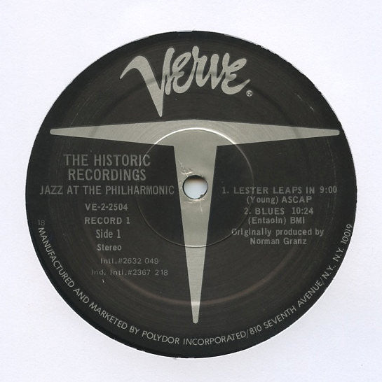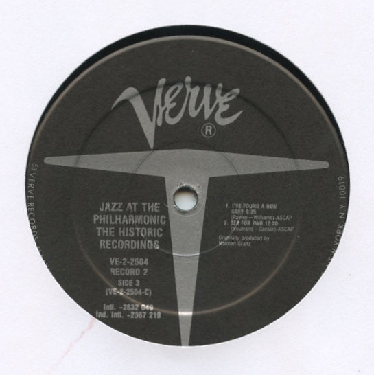 Mixed pressing version: LP1 pressed by Presswell denoted by 18 plant code in label rimtext and "PR" etched in runouts. LP2 pressed by Hauppauge Record Manufacturing Ltd. denoted by 53 plant code in label rimtext and ᐉ (isosceles triangle on its side with a dot inside) stamped in runouts. Remainder of runouts etched, mastering stamped. Issued in gatefold jacket. The first JATP Concert (July 2, 1941) with Nat King Cole, Illinois Jacquet, Les Paul and J. J. Johnson, released complete for the first time; and Billie Holiday's legendary JATP recital. Tracks A1, A2, B1 to B4, C1, C2 recorded at Philharmonic Hall, Los Angeles, July 2, 1944. Tracks D1 to D8 recorded at Embassy Theatre, Los Angeles, April 22, 1946.