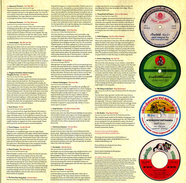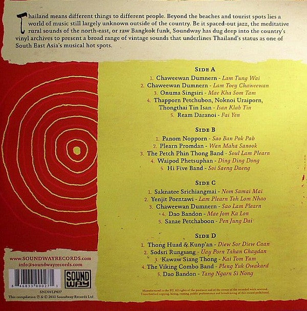 This is the page for the original release. It was re-released in Nov 2015 with identical matrix numbers and almost idental cover. The only distinction being slightly darker colours of the original cover. No 'Made in England' on the rear cover here. This mention is just visible on the 2015 repress. A1 taken from the 45 rpm Double Chicken Band 31 single A2 taken from the 45 rpm Double Chicken Band 31 single A3 taken from the Auer Ari LP "Sao Isan Rao Ruk" A4 taken from the 45 rpm Phin Khaen single (RP 3028) A5 taken from the 45 rpm Accordion single (ACD-429) B1 taken from the 45 rpm Cat single (T.P.002) B2 taken from the 45 rpm Mocking Bird single B3 taken from the Phin Khaen LP "Thai Northeast Local Music" (HLP 262) B4 taken from the Hat LP "Ding Ding Dong" (HLP 2011) B5 taken from the Srikrung LP "Hi Five" and is a vinyl-only exclusive C1 taken from the 45 rpm Golden Bell single C2 taken from the 45 rpm Krishna single C3 taken from the Krishna LP "Lam Pu Thai Yai" C4 taken from the 45 rpm Hat single (SRP 805) C5 taken from the 45 rpm Thep Panom single (TP022) D1 taken from the 45 rpm Thep Panom single (TP70) D2 taken from the 45 rpm Double Chicken Brand 31 single D3 taken from the Accordion LP "Kai Tom Yum" (ACD-7029) D4 taken from the Sida LP "All Star Singers Of Thailand With The Viking Band" (S.R.001) D5 taken from the Sound of Siam LP "Jai Yen Yen Nong Deang" (SLP-001) Released in gatefold sleeve with liner notes, photographs and credits inside Mastered at Sound Mastering, London. This compilation ℗ & © 2010 Soundway Records Ltd. Manufactured in the EU.