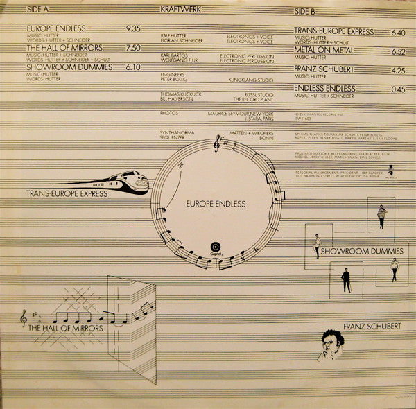 This pressing has orange center labels. Another re-pressing from 1978 with the same catalog number exists: "[r=104933" with purple labels. There is also a "[r=57526" 1993 reissue with purple center labels, which has a barcode and a different catalog number. Recorded in Germany Klingklang Studio Düsseldorf Rüssl Studio Hamburg The Record Plant Hollywood All selections published by Famous Music Corporation / ASCAP. Manufactured by Capitol Records, Inc. a subsidiary of Capitol Industries-EMI, Inc. Factories: Los Angeles, California; Jacksonville, Illinois; Winchester, Virginia. © ℗ 1977 Capitol Records, Inc. Made In U.S.A. Printed in U.S.A. There is a small Capitol® logo to the left of the fine print on the bottom of the back cover, there is also a small EMI logo to the right of the fine print on the bottom of the back cover. The 'Matten + Wiechers, Bonn' note on the inner sleeve is to credit the designer and supplier of the aforementioned equipment.