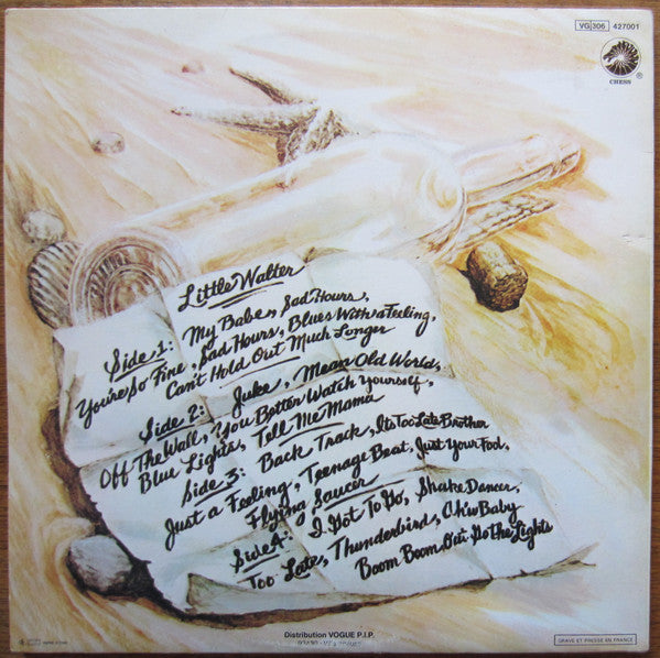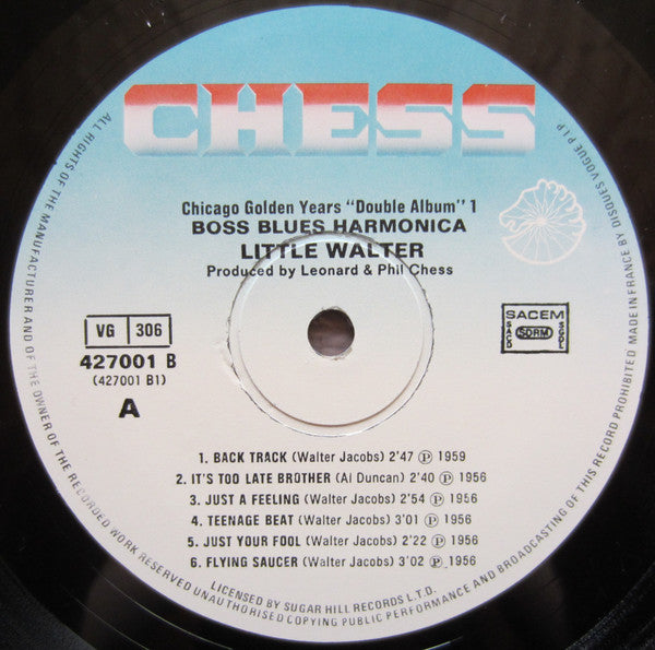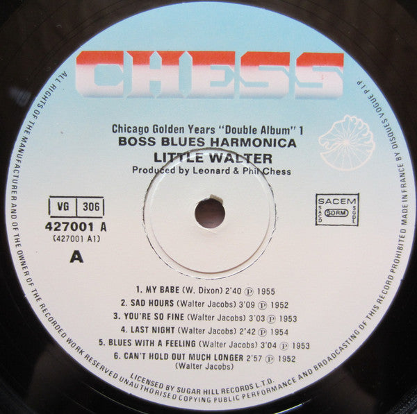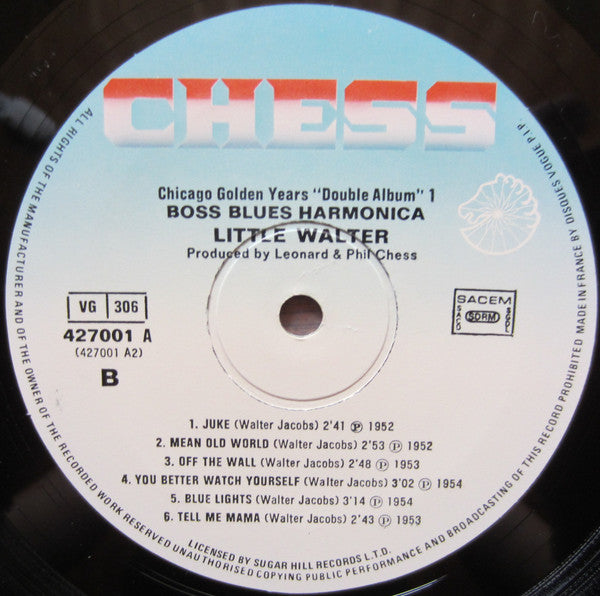 A French pressing of the reissue of the 2-LP 1972 Chess compilation Boss Blues Harmonica by Little Walter. Back cover reads: Distribution VOGUE P.I.P. 93430 - Villetaneuse -- Grave et Presse En France. Almost identical cover art to [r3195678, but this version has a small Chess logo on the upper right corner and the "Chicago Golden Years" logo on the upper left corner.