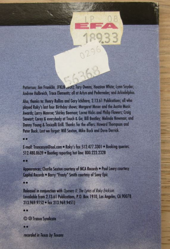 On rear sleeve: 1,2,4,6,7,8: Produced by Casey Monahan, Speedy Sparks and Stuart Sullivan. Recorded 10/93-4/94 by Stuart Sullivan at Arlyn Studio, Austin. Mixed at Pedernales Studio, Spicewood 3,5,9,10,11: Produced by Speedy Sparks. Recorded 9/84-2/85 by Lynn Gathright at Music lane Studio, Austin 3,5,9,10: Mixed 8/94 by S. Sparks and S. Sullivan, Arlyn All Songs ©1994 Roky Erickson Music (administered by Trance Elements Music, Austin) except 'Starry Eyes' (©1976) 'Don't Slander Me' (©1982) 'Haunt' (© 1982): Orb Music Co./Bleib Alien Saucer Publishing. All songs ASCAP No lyrics or credits for B9 on rear sleeve. Track B12 listed neither on sleeve nor on labels. Digital mastering: Jerry Tubb, Terra Nova, Austin Design: Greg and Bill Geisler Recorded under the auspices of Dynamic Records. Charlie Sexton courtesy of MCA Records • Paul Leary courtesy Capitol Records • Barry "Frosty" Smith courtesy of Sony Epic Recorded in Texas by Texans Printed in Canada © ℗ Trance Syndicate P.O. Box 49771 Austin, Texas 78765 P.O. Box 59 London, UK N22 1AR On Labels: © ℗ Trance Syndicate Tracks are listed sequentially on back sleeve and labels, with the exception of unlisted track B12.