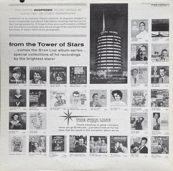 Issued on gold Capitol "The Star Line" labels. A similar version with black labels also exists, at [r=5537782. DT-1602 cat. # on labels DT1602 cat. # on jacket front, back, spine Anvil-type symbol in runouts denotes [l313252, pressing. "Duophonic" logo with "for stereo phonographs only" appears at top of jacket front cover. Title on jacket spine: "The Best of Duke Ellington" Issued in Duophonic / Full Dimensional Stereo company inner sleeve (cat. # S.B.W-6), Litho in U.S.A.