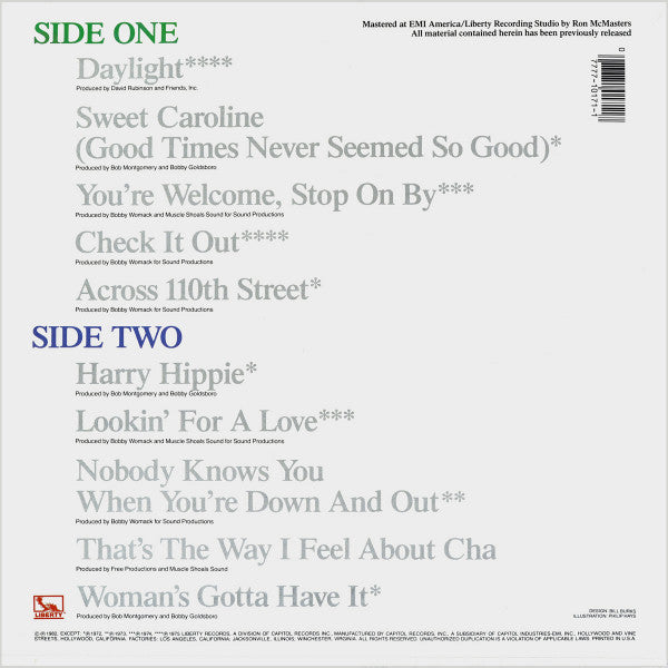© ℗ 1982, EXCEPT: A2, A5, B1, B5 ℗ 1972; B3 ℗ 1973; A3, B2 ℗ 1974; A1, A4 ℗ 1975 LIBERTY RECORDS, A DIVISION OF CAPITOL RECORDS INC., MANUFACTURED BY CAPITOL RECORDS INC., A SUBSIDIARY OF CAPITOL INDUSTRIES-EMI INC., HOLLYWOOD AND VINE STREETS, HOLLYWOOD, CALIFORNIA PRINTED IN U.S.A. Jacksonville pressing, identified by 0 stamped in the runout.